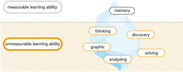 In the above figure, the measurable learning ability refers to visible learning ability, while the unmeasureable learning ability refers to invisible learning ability. Visible learning ability generally refers to the field of knowledge, and the evaluation indicator is how much knowledge or skills have been learned, which can be taught by others, remembered by memory, and immediate results can be seen. Invisible learning ability generally refers to the sensory field, focusing on cultivating useful habits. It refers to the ability to think and solve problems on one's own. Through the cultivation of invisible learning ability, children's subjectivity and thinking ability will become stronger, their application ability and problem-solving ability will become stronger, and children will become more and more fond of learning! Although the effect cannot be seen immediately, it will be seen in the future.